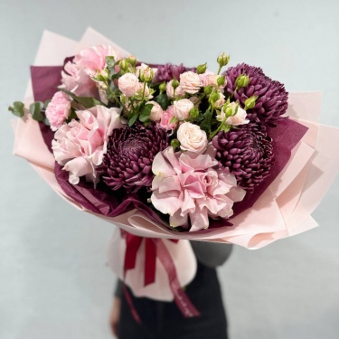 Авторский букет с бигуди-хризантемой, французскими розовыми розами, кустовыми розами и диантусами